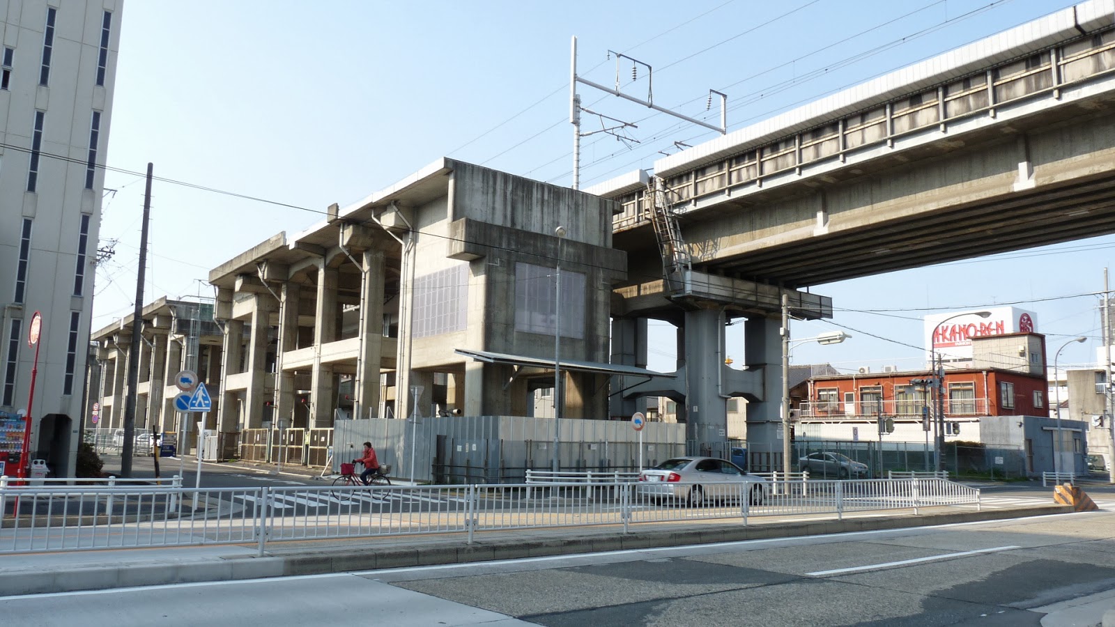 江川線を超え、南郊公園沿いに歩くと南方貨物線が見えてきました。高架橋跡にパチンコ店が入っている所です。