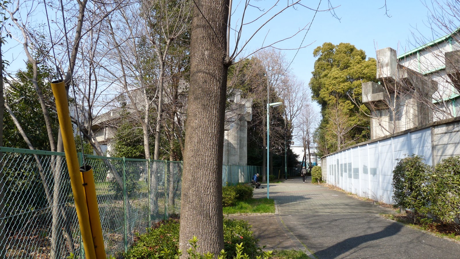 遊歩道から出て先回りすると・・・南方貨物線の高架の上に車が停まっています。駐車場として再利用されているようです。