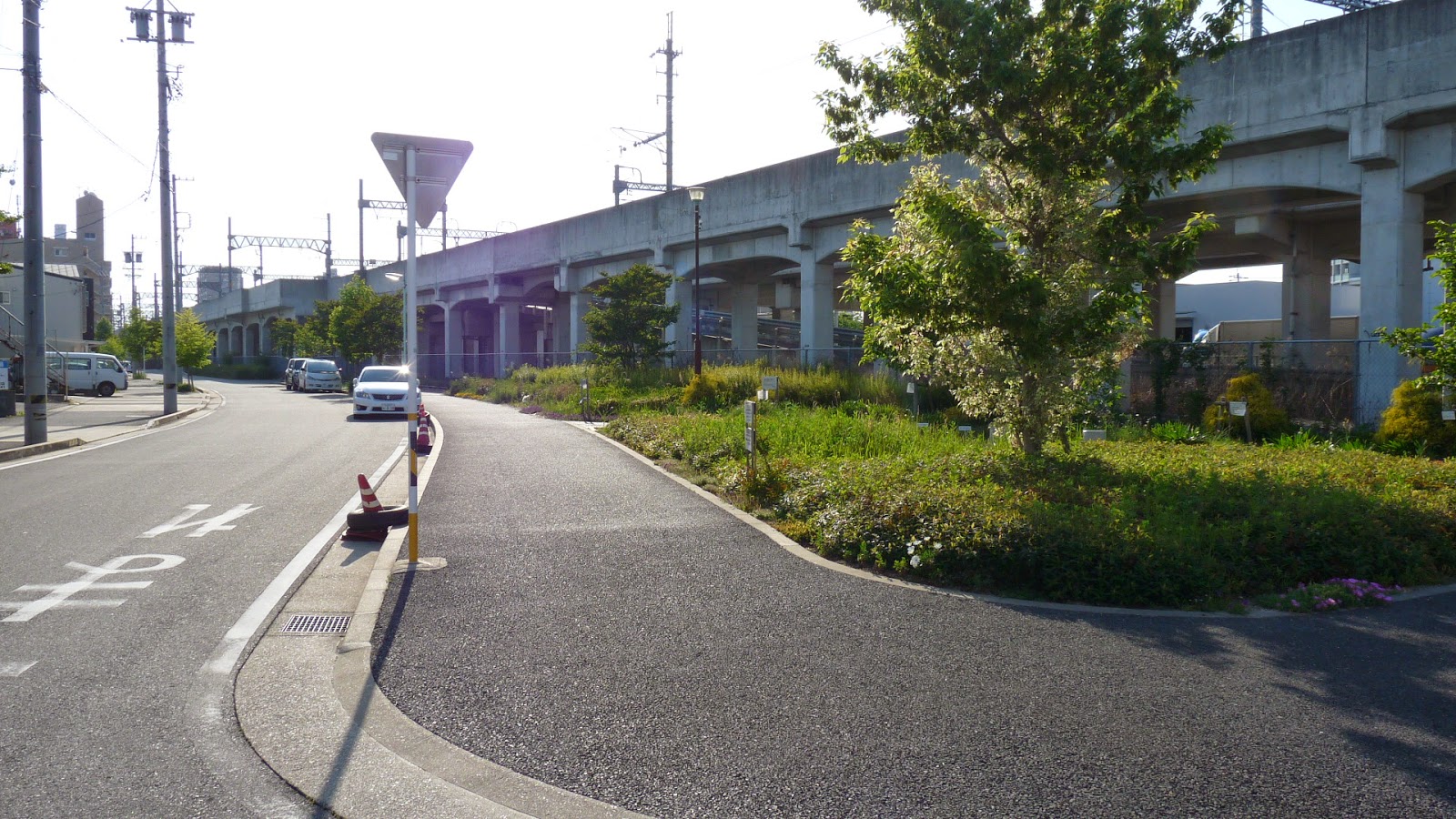 視線を北側へ移すと、左側の道路が不自然なカーブの南端です。右側のはあおなみ線沿いの道路。